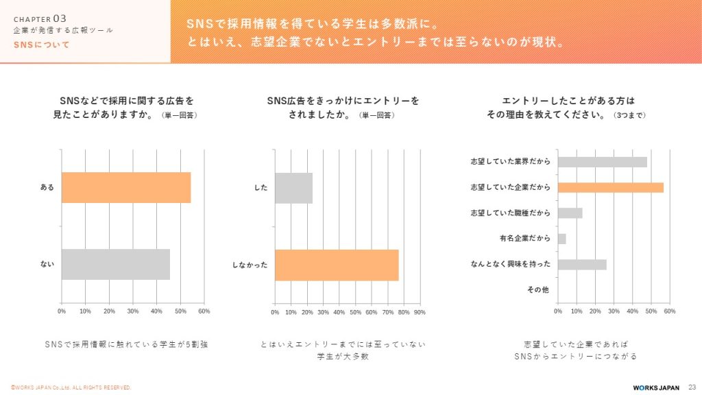SNS経由で採用情報を目にした学生は5割を超えましたが、実際にエントリーに至る割合は限定的でした。