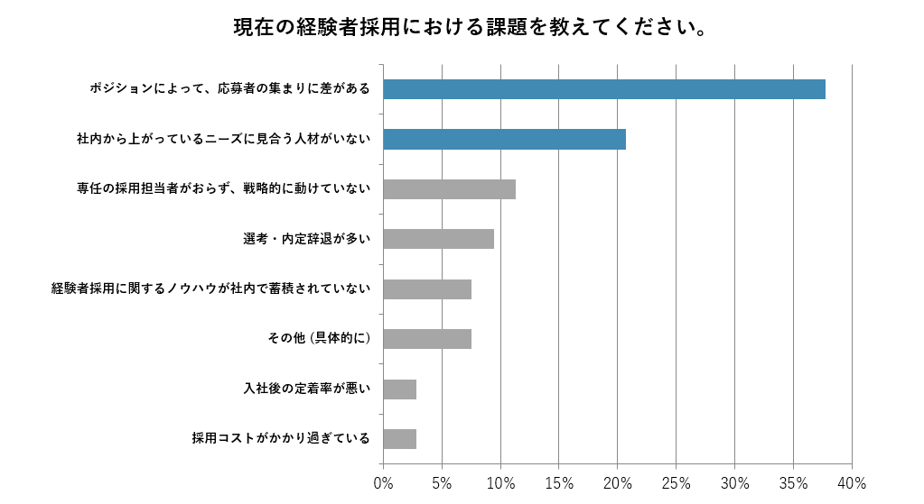 また、経験者採用における課題としては、「ポジションによって、応募者の集まりに差がある」「社内から上がっているニーズに見合う人材がいない」などが挙がり、多くの企業が応募の偏りや応募者の質に課題感を抱いているようです。
